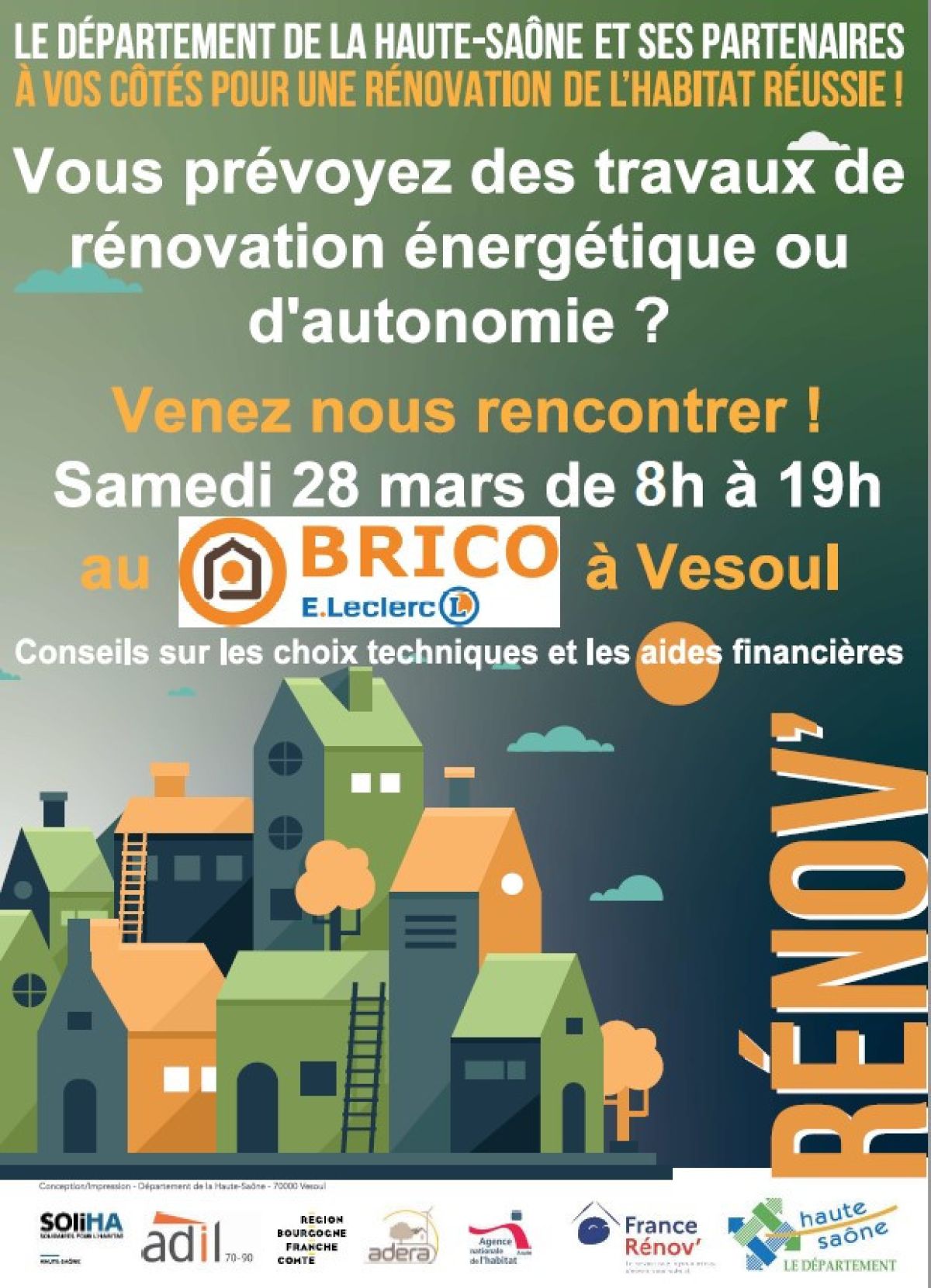 Les partenaires du Département de la Haute-Saône sur l’habitat seront présents toute la journée du samedi 28 mars au Brico Leclerc de Vesoul, de 8h à 19h.