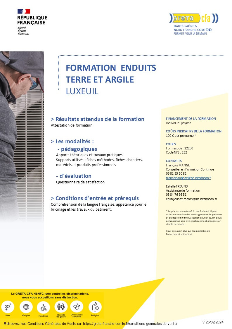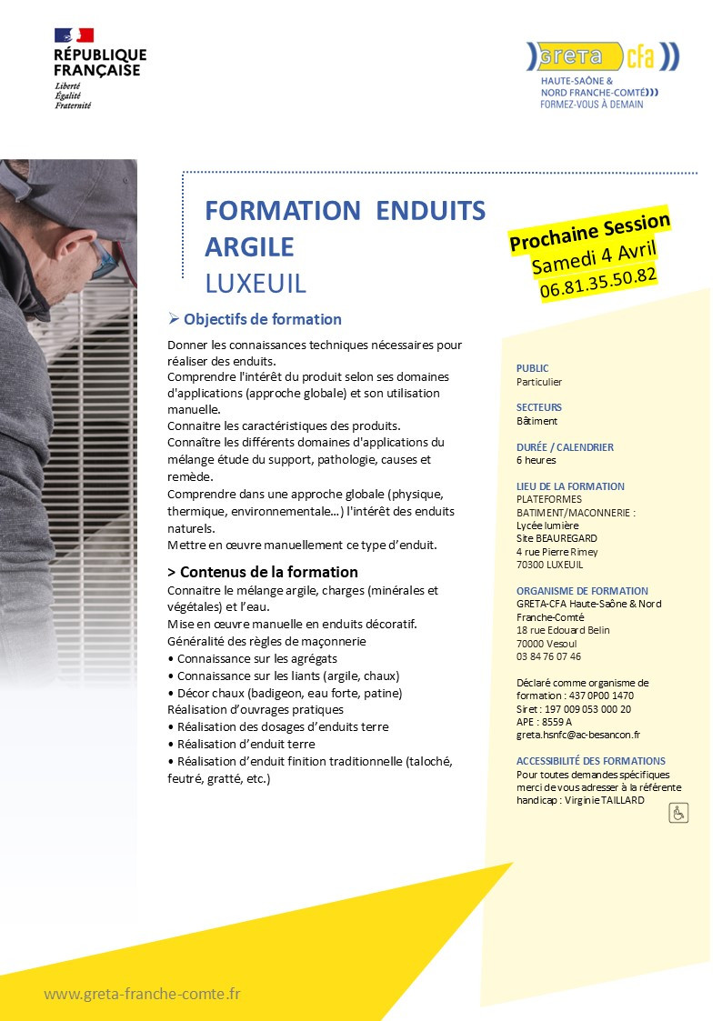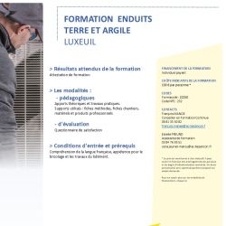 Cette formation sur les enduits terre est organisée par le lycée Lumière à Luxeuil-les-Bains. Une journée complète de formation dédiée aux particuliers. Vous trouverez les détails ci-contre.