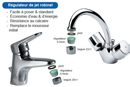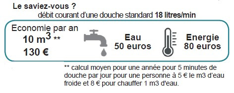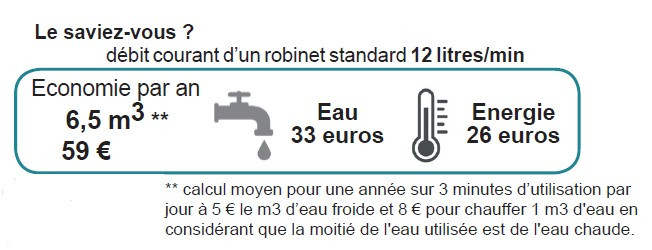 - 2 mousseurs à économie d’eau d’un débit garanti de 6 litres/minute (au lieu de 10 à 12 l/min généralement) ;