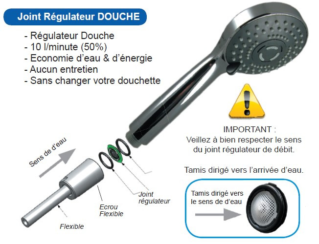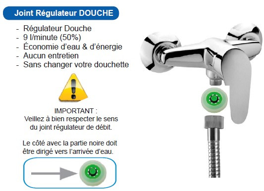 - 1 joint régulateur pour la douche d’un début de 9 litres/minute (au lieu de 12 à 18 l/min généralement).